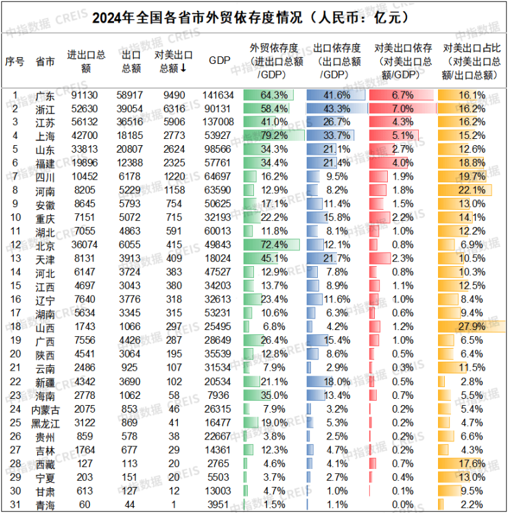 此外,需关注关税局势升级对部分城市的潜在影响,外向型经济城市可能面临阶段性压力,在部分出口企业经营承压及居民就业收入波动情况下,居民购房节奏或受到影响。从城市出口依存度来看,广东、浙江城市出口依存度普遍较高,深圳、东莞、苏州、宁波等多个城市出口占GDP比重超30%(全国为18.9%)。从各省对美出口情况来看,浙江、广东、江苏三省对美出口占中国对美出口总额的58%,山西、河南、四川和福建四省对美出口占当地出口总额比重最高,均超18%。目前因关税影响时间尚短,同时网签数据存在一定滞后,高依存度城市房地产市场交易量与市场整体差异尚不明显,后续变化仍需持续观察。 数据来源:各城市统计局、海关总署
