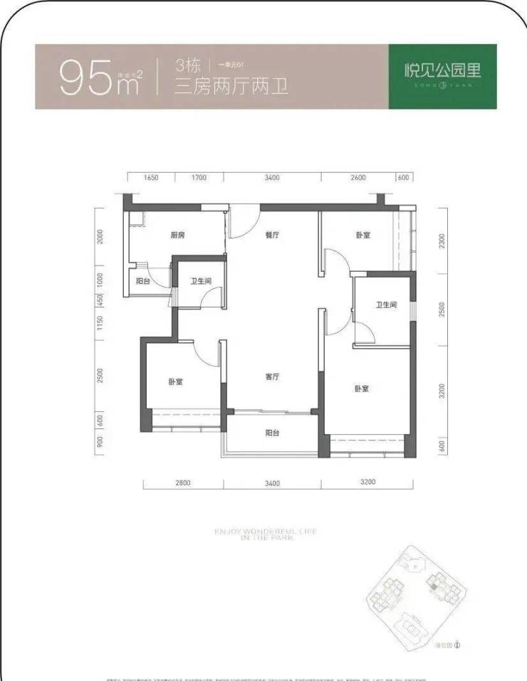 95㎡的3房2厅2卫,仅3栋1单元01户型,设计的是竖厅双龙抱珠格局,客厅3.4米开间,三开间朝南,3个卧室分别做到了3.2米/2.8米/2.3米的宽度,L型厨房带1个生活阳台,公卫三段式分离,得房率73.71%(不含赠送),西南朝向。