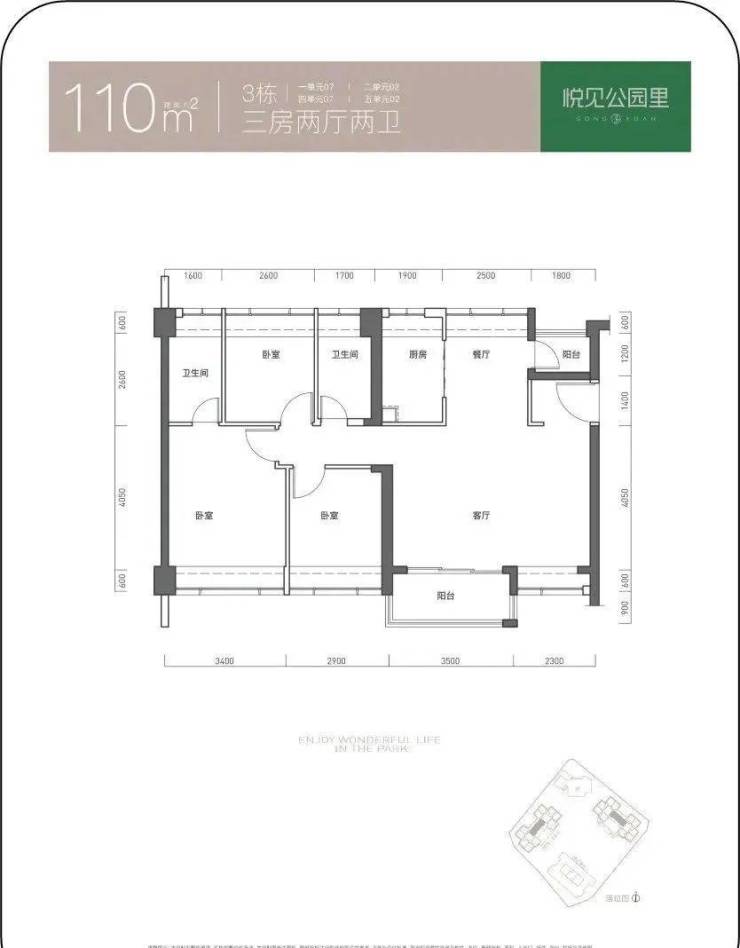 110㎡的3房2厅2卫,设计的是横厅大开间格局,客厅5.8米开间,南北通透双阳台,三开间朝南,3个卧室分别做到了3.4米/2.9米/2.6米的宽度,U型厨房,公卫三段式分离,得房率73.71%(不含赠送),阳台主朝西南或东南向。