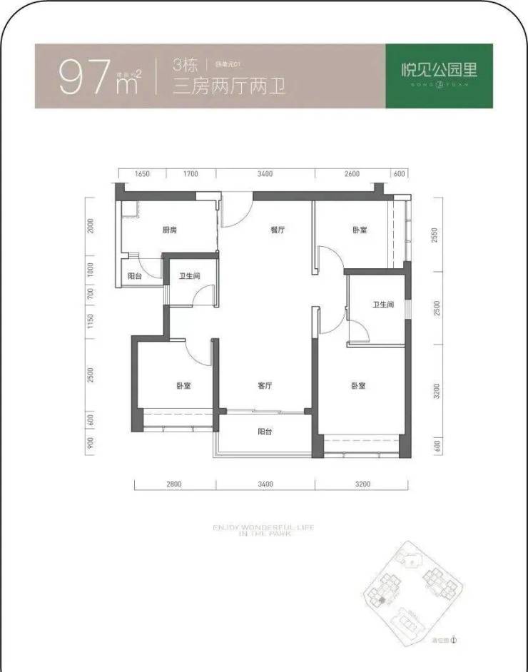 97㎡的3房2厅2卫,仅3栋4单元01户型,设计的是竖厅双龙抱珠格局,客厅3.4米开间,三开间朝南,3个卧室分别做到了3.2米/2.8米/255米的宽度,L型厨房带1个生活阳台,公卫三段式分离,得房率73.61%(不含赠送),东南朝向。