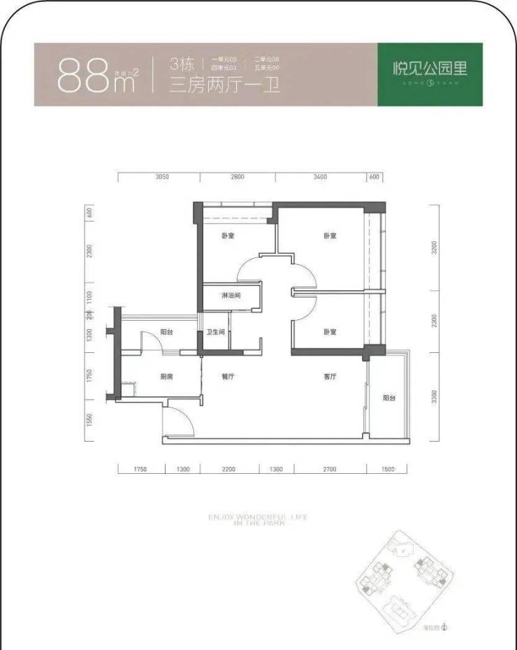 88㎡的3房2厅1卫,设计的是经典竖厅格局,客厅3.3米开间,LDKB一体化设计,动静分区,3个卧室分别做到了3.2米/2.8米/2.3米的宽度,L型厨房带1个生活阳台,公卫三段式分离,得房率73.71%(不含赠送),有西北、东北、西南或东南朝向。