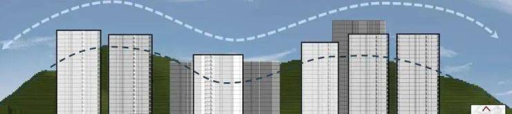 建筑布局南北朝向,山体走势与楼体朝向形成高差,自然微风在社区内穿梭流动,形成舒适的微风人居环境