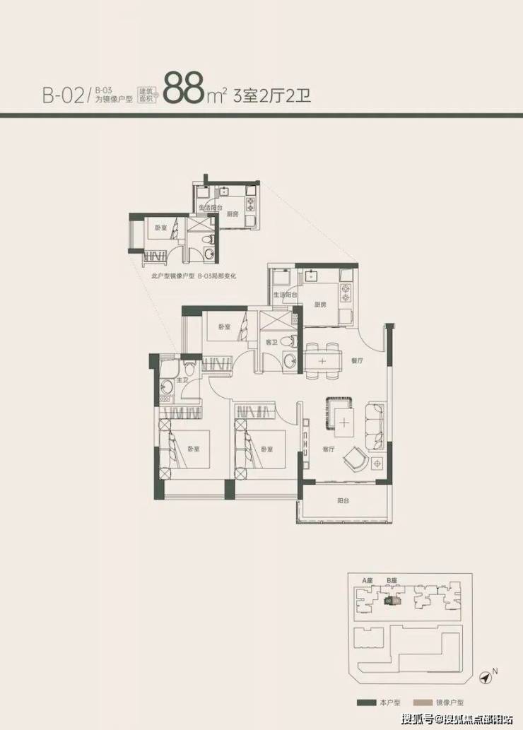 南北通透四房户型,是「京地海樾府」最大的户型,主阳台朝西北,生活阳台朝东南。同样位于1B座的2梯4户结构,这个户型只有58套,适合改善需求和周