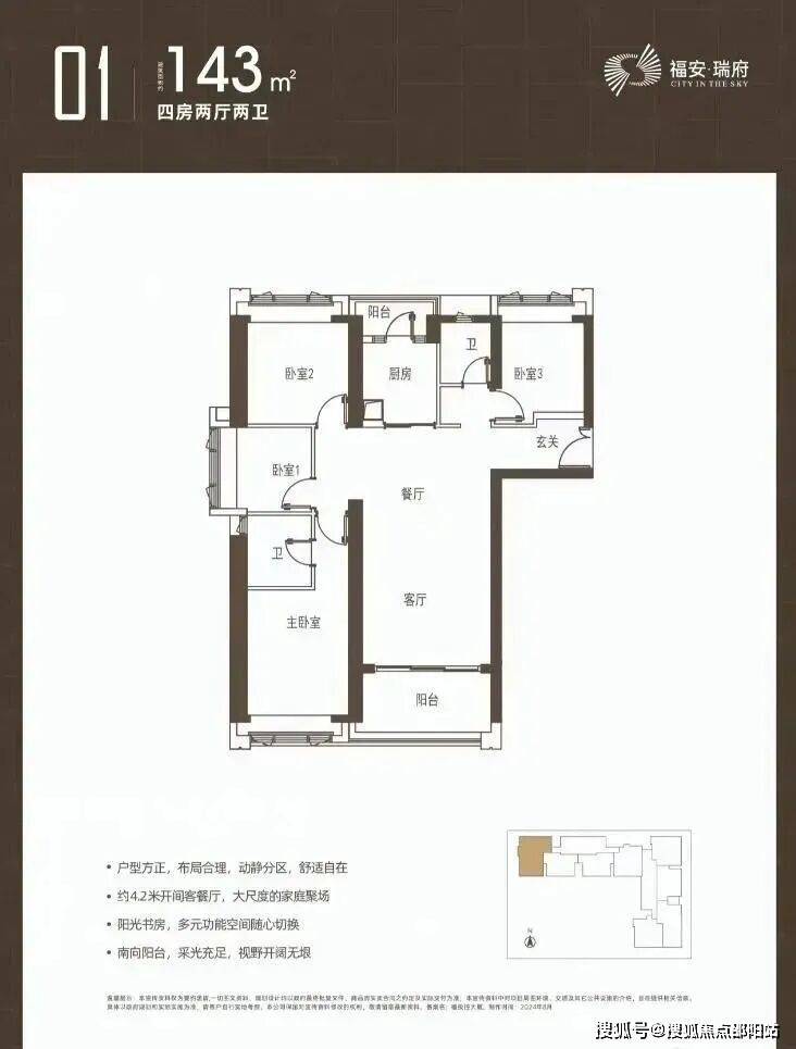 福安瑞府全套户型图已经公示,主推建面约97-98-112-126-143㎡的3-4房产品。户型均设计有双阳台、双套房。其中,97-98㎡3房两卫户型为双龙抱珠格局;113㎡户型为经典竖厅格局;126㎡的4房2卫设计有大景观阳台,不过户型整体欠方正;143㎡户型功能分区欠佳,不过三面采光较好。