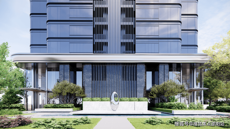 单元门庭以中轴对称布局升华归家仪式,通透玻璃体量将架空层花园景致尽收眼底。