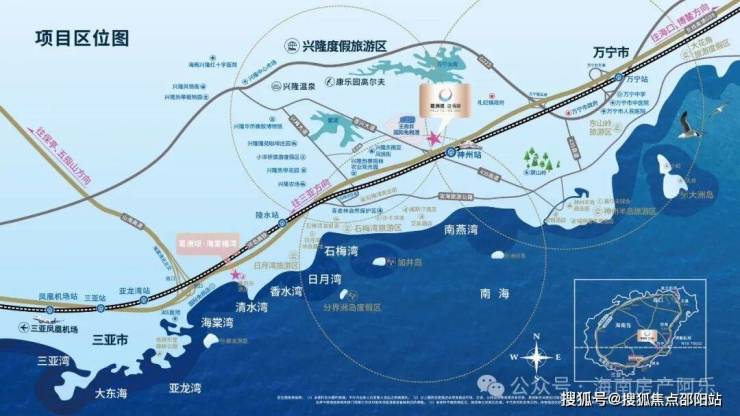 项目位于万宁兴隆温泉旅游度假区、滨海湾区、万宁市区三区交汇处,紧邻交通枢纽,享环岛高速、环岛高铁、三大机场,立体交通网络畅达全岛。