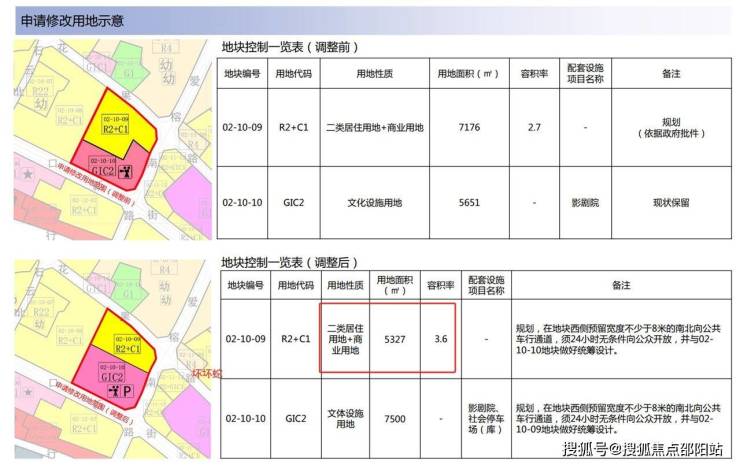[蛇口地区]法定图则02-10-09地块,用地面积由“7176平方米”调整为“5327平方米”,总容积保持不变,容积率由2.7调整为3.6,备注由“规划(依政府批件)”调整为“规划,在地块西侧预留宽度不少于8米的南北向公共车行通道,须24小时无条件向公众开放,并与02-10-10地块做好统筹设计”。