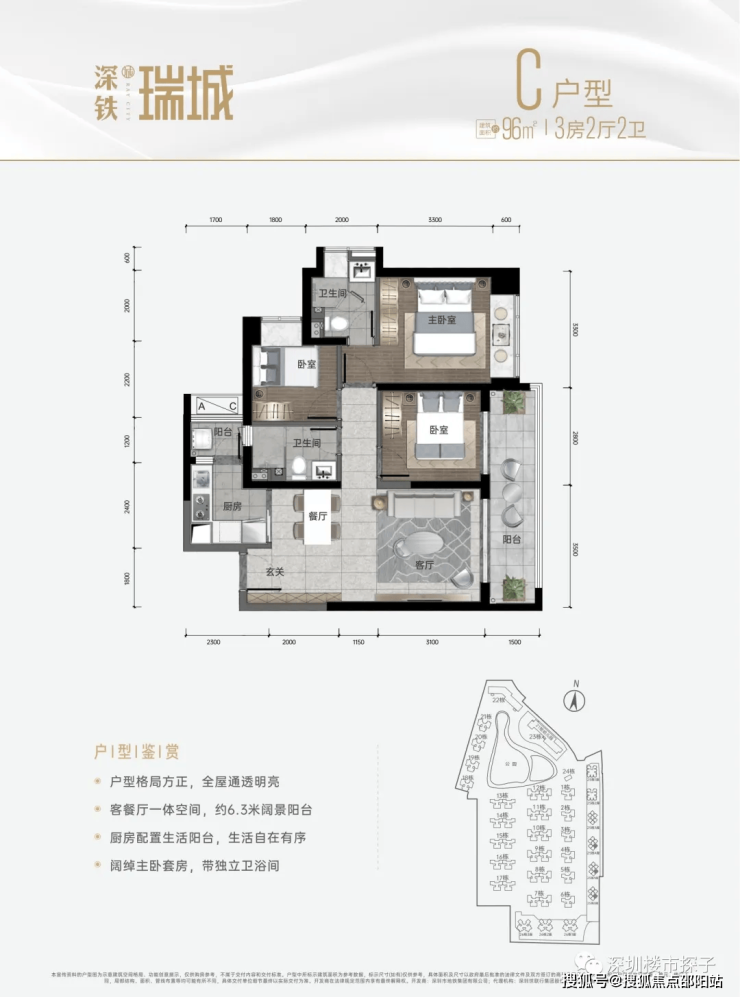 产品面积段:建面约96-100㎡三房