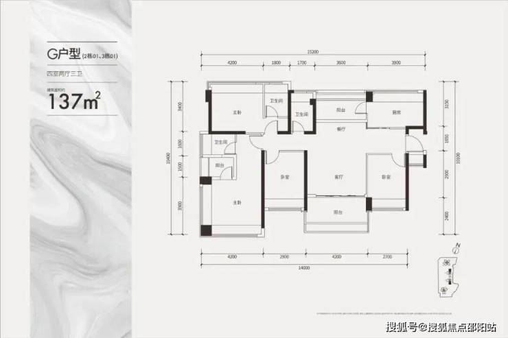 建面约137㎡双套间户型(四房三卫)