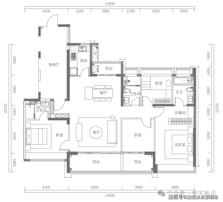 D户型建面约173㎡,4房2厅2卫