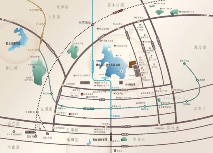 值得一提的是,区域内规划地铁R1线支线和R4线,未来R1线支线将与深圳地铁22号线接驳,联通东莞和深圳的公共交通。