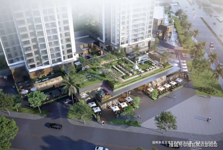 【抬高式檐上浮岛花园露台】:约1000㎡,位于商业街区顶层,业主私享花园露台,提供丰富空间活动区域,是邻里交流娱乐的理想场所。