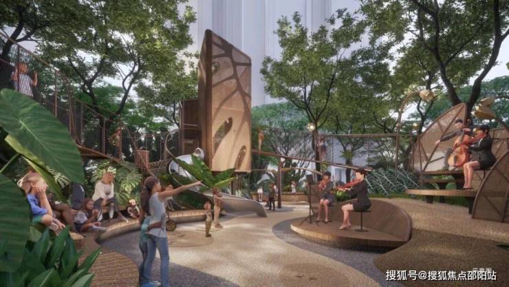 【达尔文营地游乐场】:约1500㎡规模,营地以大叶王国为主题,将生态教育、艺术文化结合成为自然探索乐园、游乐场为一体的多元活动场景。同时于6栋架空层相连,配置儿童自由玩耍的空间。