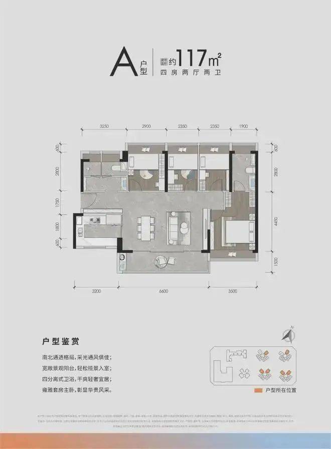 :横厅布局,客厅开间5.9-6.6米,南北通透,主卧套房设计;