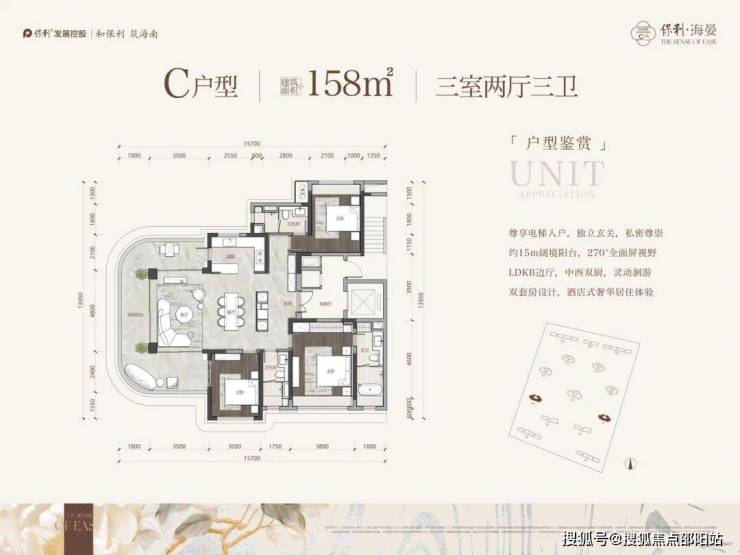 【三亚海棠湾】保利·海晏70年产权奢旅大平层丨礼献国岸海棠湾【占地面积】约87亩 【总 建 面】约11.9 万㎡【容 积 率】1.4【绿 地 率】40%【产权年限】70年【规划楼栋】14 栋【总户数】546户(14栋、类一梯一户)【户型面积】建面约 107-210㎡【停 车 位】共810个,约1:1.48