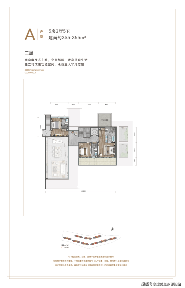 在保障居住奢适及高尔夫景观最大化的设计理念下,观云居户型建筑面积约355-375㎡,面宽超20米,采用5室设计,其中4室朝南,实现起居、视野等极致享受;为了追求更奢适的生活体验,更以套房规格,打造双主卧空间,以独立衣帽间、双台盆配独立浴缸卫浴间等创造出无以复加的奢阔。