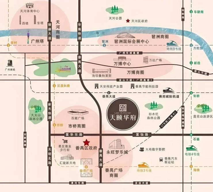 ① 地处番禺广场板块,四地铁交汇的广州枢纽级交通中心(3 号线、18 号线、22 号线、17 号线)