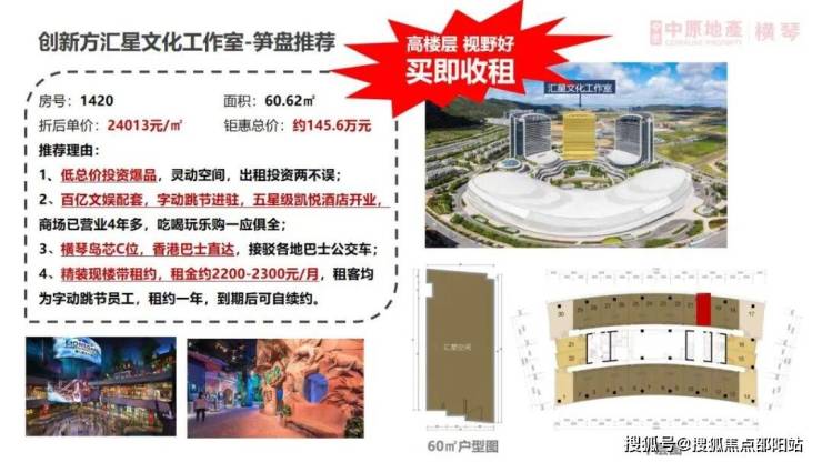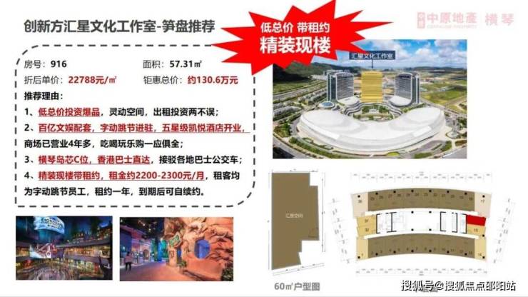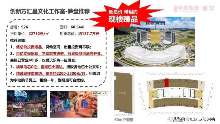 横琴粤澳深度合作区率先落地的文旅商业综合体全现楼产品,即买即入驻即办证,所见即所得,标准安心兑现。优于其他产品的50年产权,层高约3.9m,开放式格局灵动百变。