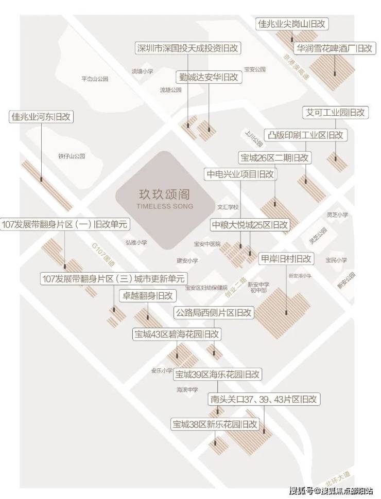 新安片区,尤其是在沿前进路正在进行着大规模的城市更新,分布着共20个旧改项目,超千万的旧改体量,相当于新安整个片区重建。仅我们项目2公里范围内就汇聚了8个旧改项目,分别是沃尔玛购物广场片区旧改、安华工业东区旧改,卓越翻身旧改、宝城碧海花园旧改、公路局西侧旧改、甲岸村旧改、宏发新领域、中洲中央公园二期。