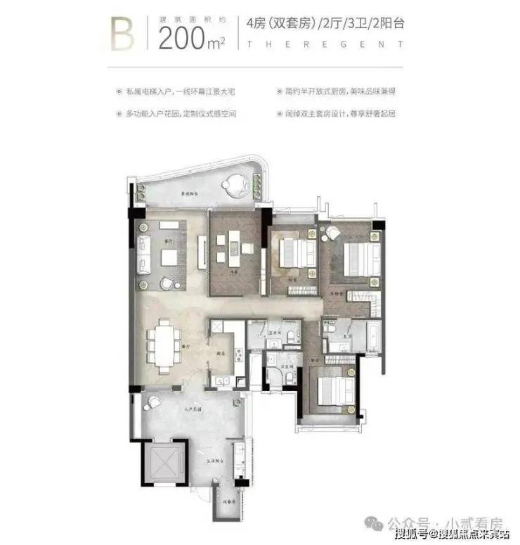 『天启』组团面积约140-250㎡环幕临江大平层,坐拥江景第一排,眺望小蛮腰,享500米宽阔无遮挡江景视野,并邀请三大全球知名设计大师倾力打造,并配备12大国际一线品牌交标,专梯专户四房双套房设计,世界灵感前沿作品礼献广州!