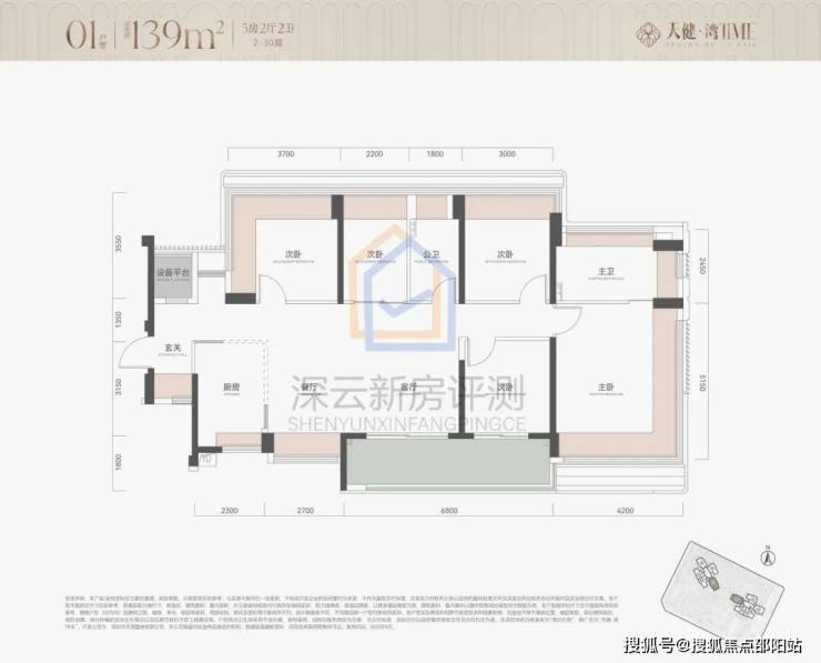 项目占地约1.37万㎡,建面约5.89万㎡,规定容积率2.8,绿化率30%,由2栋总高30层不超过100米建筑组成,单层层高3.15米,2梯5户,推售面积113-115㎡四房两卫和139㎡五房两卫,共290户,配380个车位,车位比1:1.31。