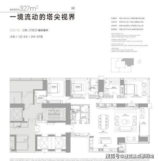 公寓面积段覆盖300-1000㎡(具体包括300㎡、400㎡、460㎡、570㎡、1000㎡等大平层),起步户型预计200㎡以上,主打“总裁级大平层”,满足高净值人群对空间尺度与私密性的需求。