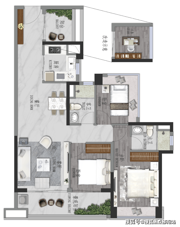 约99㎡3+1房2卫,户型升级,灵动入户空间,南向约6米阳台,尽揽自然景观,主卧套房,私密生活。