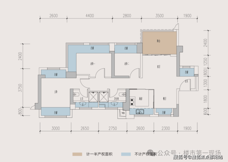 3室2厅2卫,南北通透,客餐厅5.6米宽,带11㎡阳台。主卧及次卧双飘窗,全屋12个飘窗。L型厨房,可改4房,赠送面积24㎡,得房率104.44%(含赠送)。