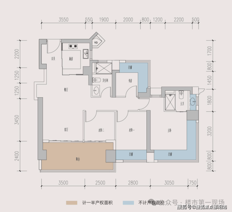 3房2厅2卫,西南向,竖厅格局,客厅3.5米宽,三开间朝南。主卧15.1㎡带270°飘窗。赠送面积16.96㎡,得房率96.84%(含赠送)。