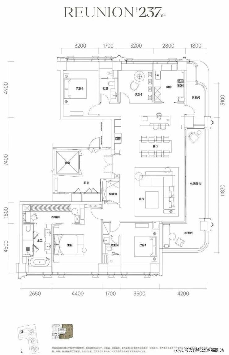 约237㎡ 四房三卫两厅、三面采光、双主卧套房、270°环幕视野。