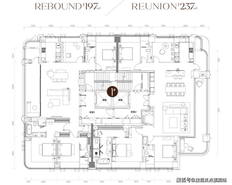 两个户型都是四房三卫+家政间设计,进门就是大客厅,卧室分布于客餐厅南北两侧,均拥有超大观景阳台。