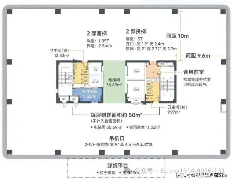 内部空间以“摩天工厂”理念颠覆传统:标准层高4.5–6米,首层荷载达1.2吨/㎡,平均9米超大柱网创造无柱开阔空间,方便生产线灵活布置与管线综合排布。配备进口日立品牌电梯系统,包括2台3吨货梯、1台VIP客梯及1台普通客梯,首层设独立卸货平台,实现人货分流,极致提升运营效率。