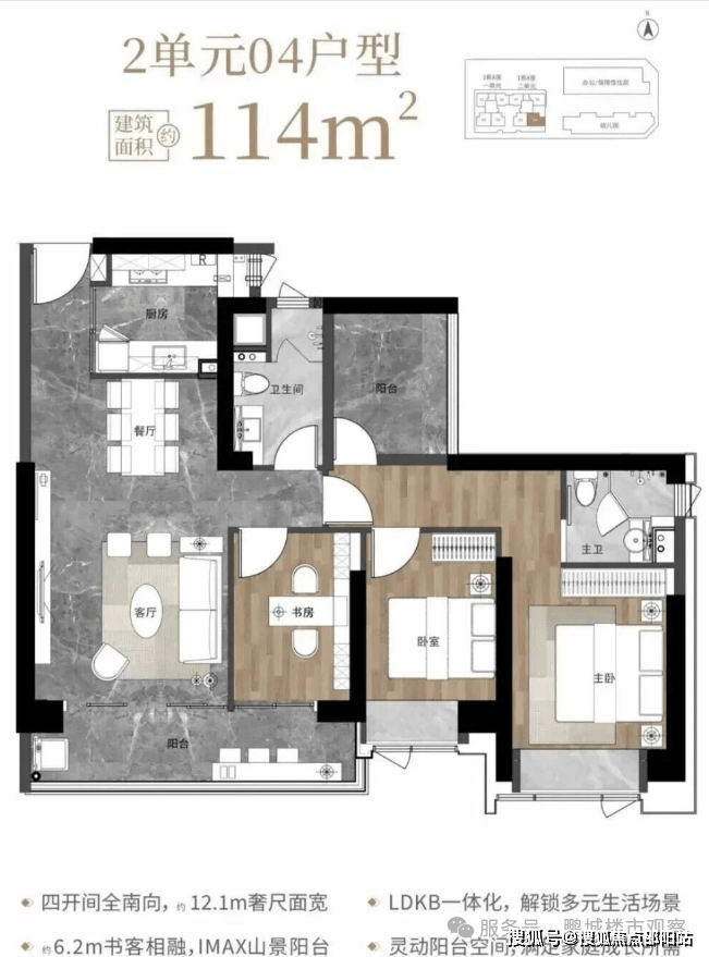 114㎡的4房2厅2卫,1栋2单元04户型,设计的是经典竖厅格局,客厅3.85米开间,LDKB一体化设计,动静分区,四开间朝南,12.1米面宽,二字型厨房,卫生间干湿分离,客厅连接次卧出6.2米长大观景大阳台,正南朝向。