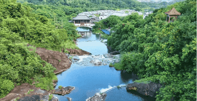 中海汤泉,占地约1.7平方公里, 依山傍水,坐拥“一泉一湖两水五山”独特自然景观,小溪、瀑布、山 涧、梯田、碧水环绕其中。自宋代以来,历代文人墨客纷纷循迹而至,大文豪苏东坡更是三游汤泉,九龙潭摩崖石刻上至今仍留存着他的名句“一洗胸中九云梦”