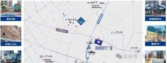在商业配套方面,锦绣时代广场紧邻壹方天地,这里有众多的购物MALL和丰富的娱乐设施。此外,项目周边还有星河ICO、绿景左阾香颂、岁宝PLAZA、天虹商场、优城购物中心等多个购物场所,满足生活所需。