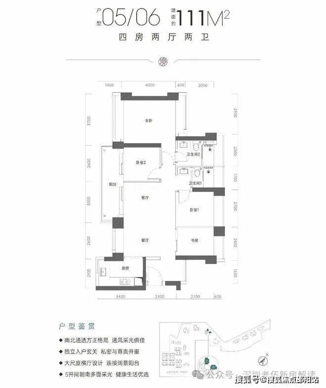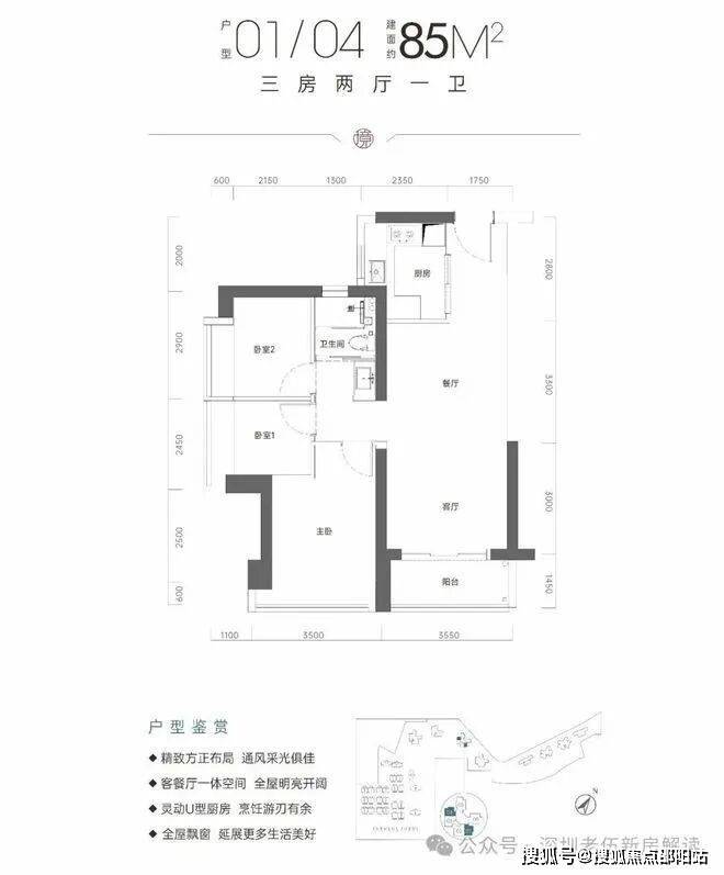 :设计的是竖厅格局,进门入户玄关,客厅3.6米开间,LDKB一体化设计,动静分区,U型厨房,卫生间三段式分离,得房率约75.4%(不含赠送),西南或东南朝向。
