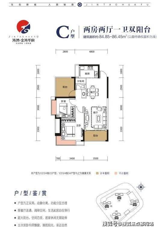 建面约84.85-86.45㎡两房两厅一卫双阳台