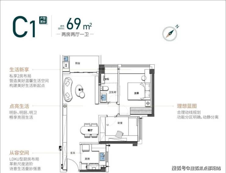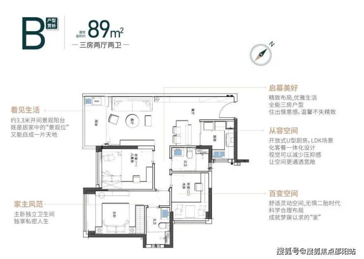 户型亮点:69㎡做到三房两卫,空间利用率高(飘窗改地台、L 型厨房等),动静分区合理。