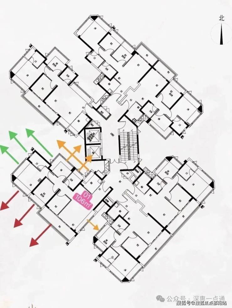 绿色箭头呢主卧的次飘窗,主卫,小卧室的西偏北朝向,看出去是马路,虽然也会跟1栋有点对视,但是比106的会好点这个位置不会完全遮挡