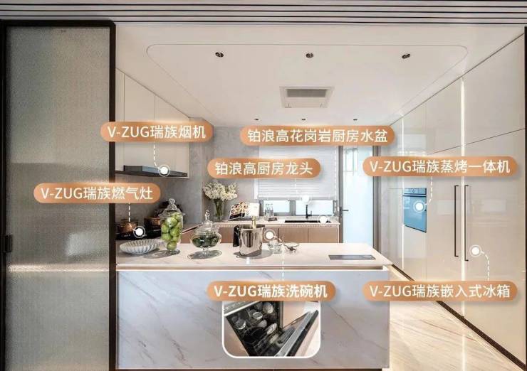 重塑厨房空间,北向连接窗户或者阳台,南向面对客厅,无界洄游动线,匠筑开放式社交生活场域,大U型操作台空间+I型橱柜收纳空间,一线品牌厨电套装加持实现高级感“烟火气”。