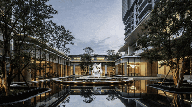 超大落地玻璃立面和水景结合,展现出透明与浮空感,带来了视觉的通透,也唤醒了度假的情绪。