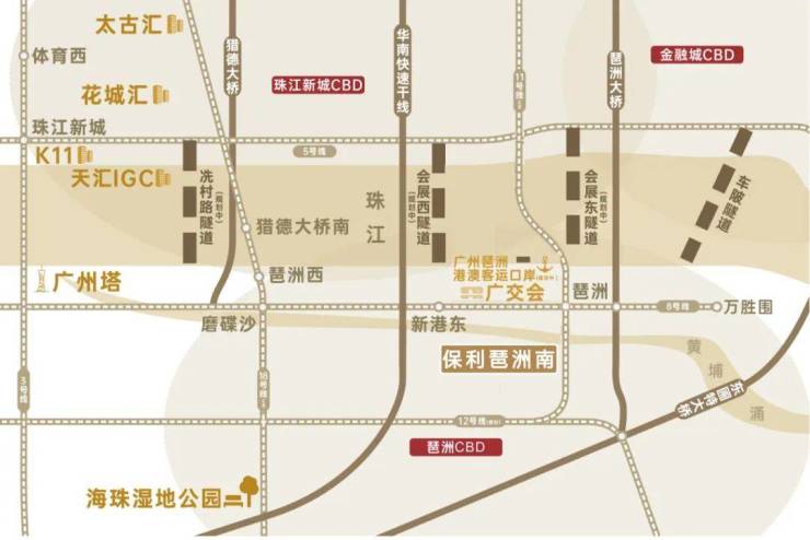 保利天奕坐落于琶洲南片区,处于珠江新城、金融城与琶洲构成的"黄金三角"核心区域。交通方面,项目距地铁8号线、11号线琶洲站约900米,未来还将连接在建的10号线、11号线赤沙站,交通网络便捷。周边商业配套成熟,六元素体验天地、南丰汇等商业综合体环伺;医疗资源丰富,广东省第二人民医院等三甲医院提供保障;教育方面,项目规划配建私立国际学校,东南侧36班九年一贯制公立学校(已确定由广州五中领办)也已官宣。