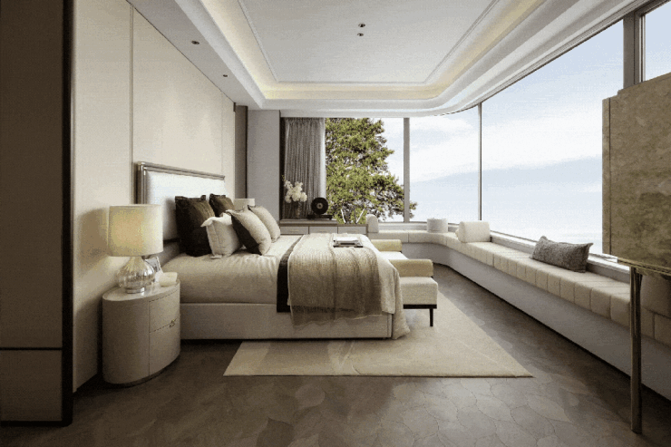 借鉴马尔代夫丽思卡尔顿酒店为原型打造,利用大面落地玻璃代替实墙,打造通透开放的空间,实现室内外的交互感,让业主感受到一种自然的、岛屿式的、漂浮氛围。