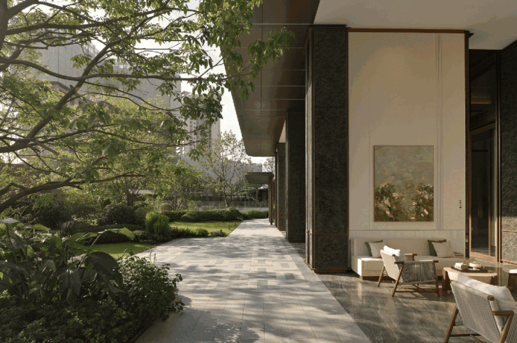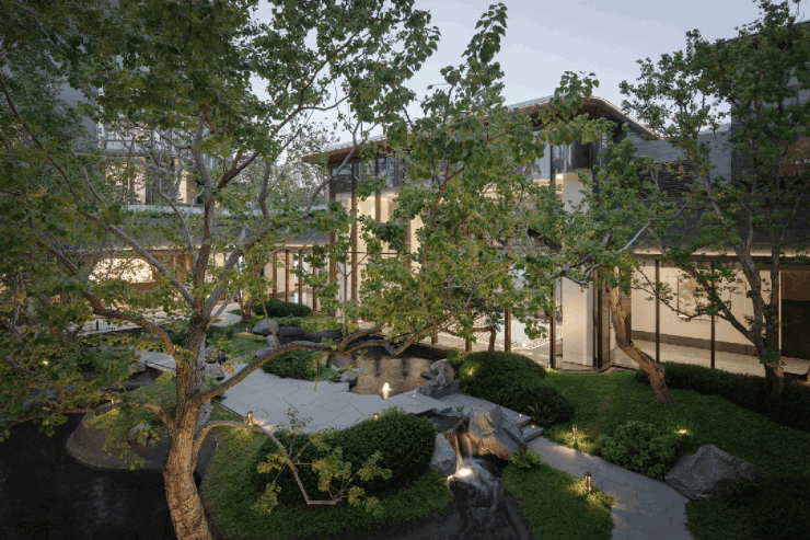 首先,项目没有采用常见的装饰性园林,而是营造出可进入、可沉浸的东方森系立体庭院。