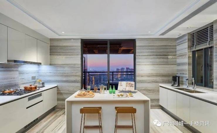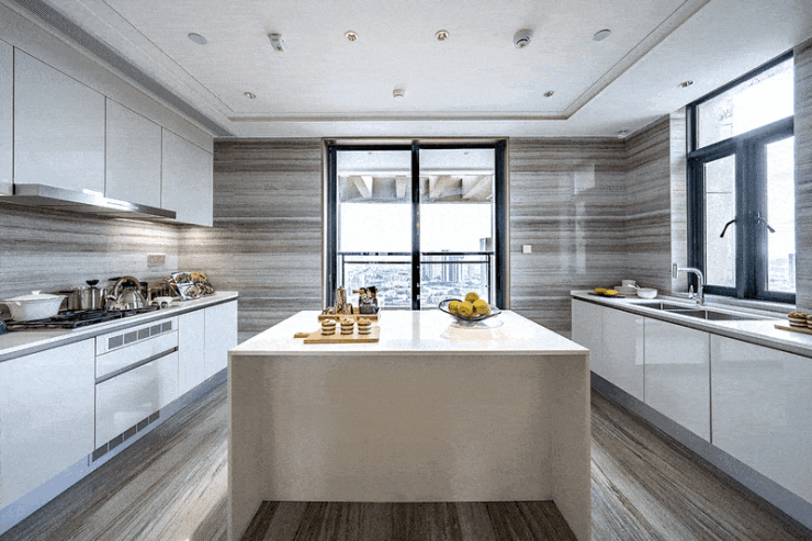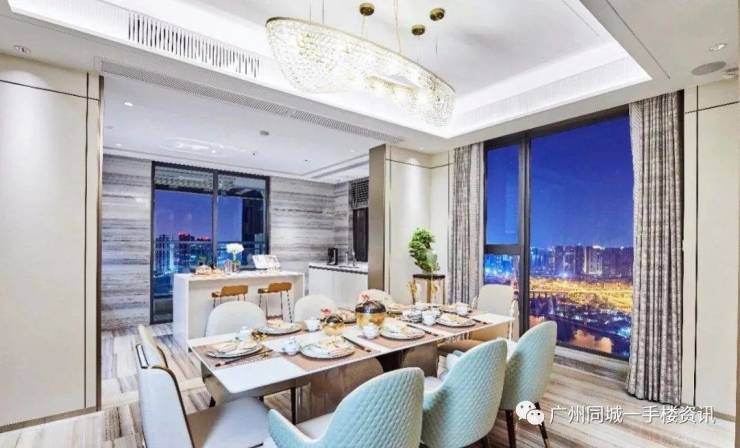 餐厅与厨房相连,从天花、墙面到地板无不经过一番装饰,若是高楼层还能与江共饮,气派的家宴、派对随时能从容上演。