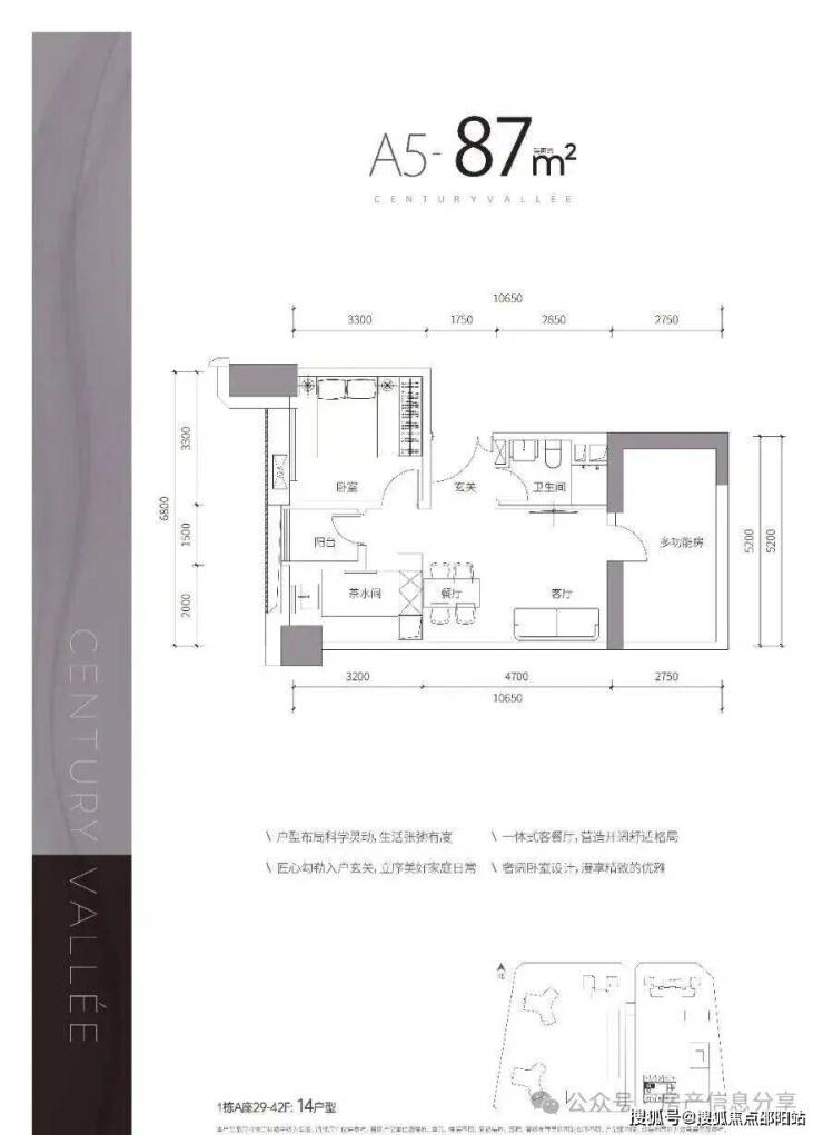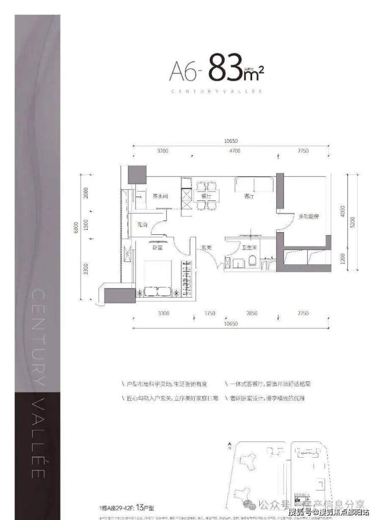 项目简介:总建筑面积约39万㎡,涵盖天际住宅、高端公寓、下沉式商业街等多种业态为一体,首推的1栋A座建面约67-87㎡天赋臻寓