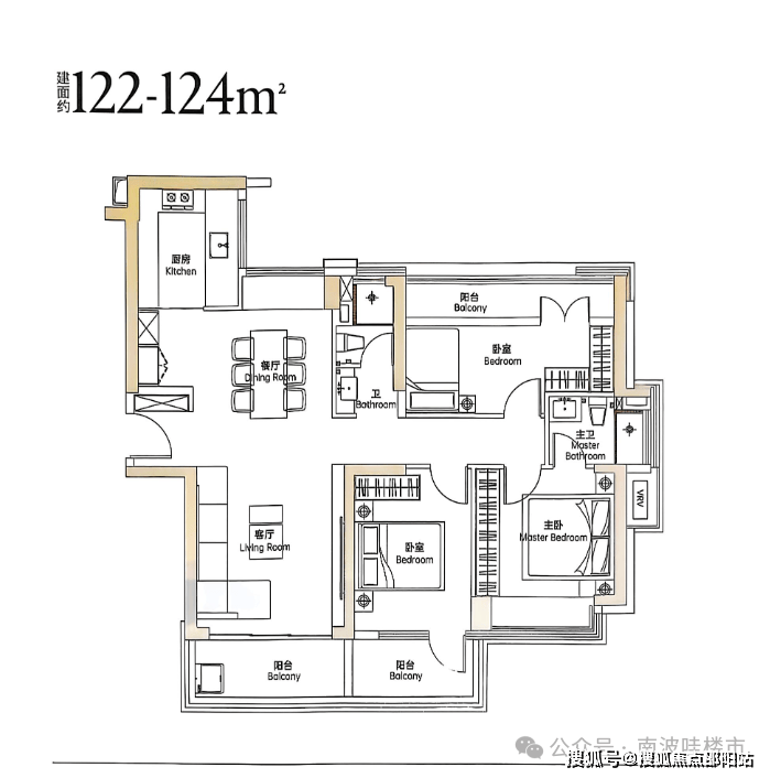 123㎡四房两厅户型,传统中规中矩户型,与122㎡进门口与厨房方位不一致,均采用双阳台设计;