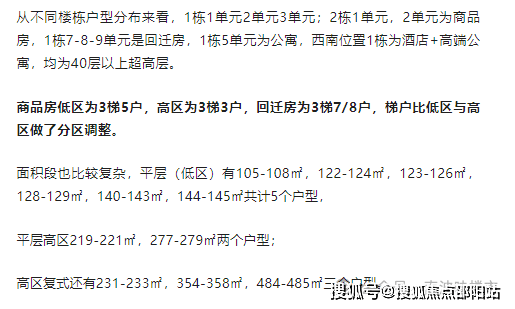 其中1栋1单元/2单元/3单元和2栋1单元/2单元为商品房,1栋4单元为保障房,1栋5单元为商务公寓,1栋6单元/7单元/8单元为回迁房,3栋为幼儿园。