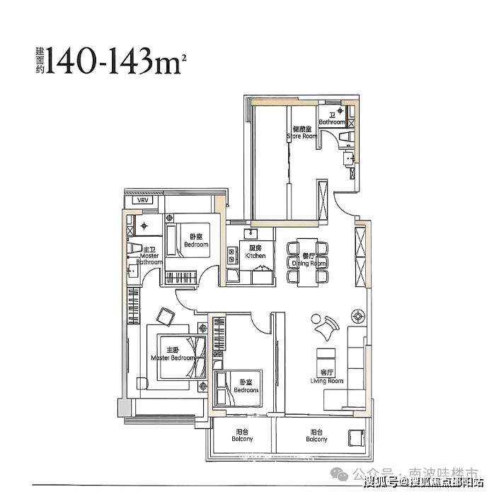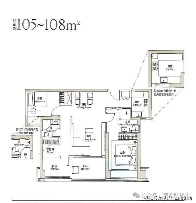 105㎡三房两卫采用房间左右侧设计,传统说法双龙抱珠,基本没有浪费空间,户型拓展率大,阳台以实体样板房为准;