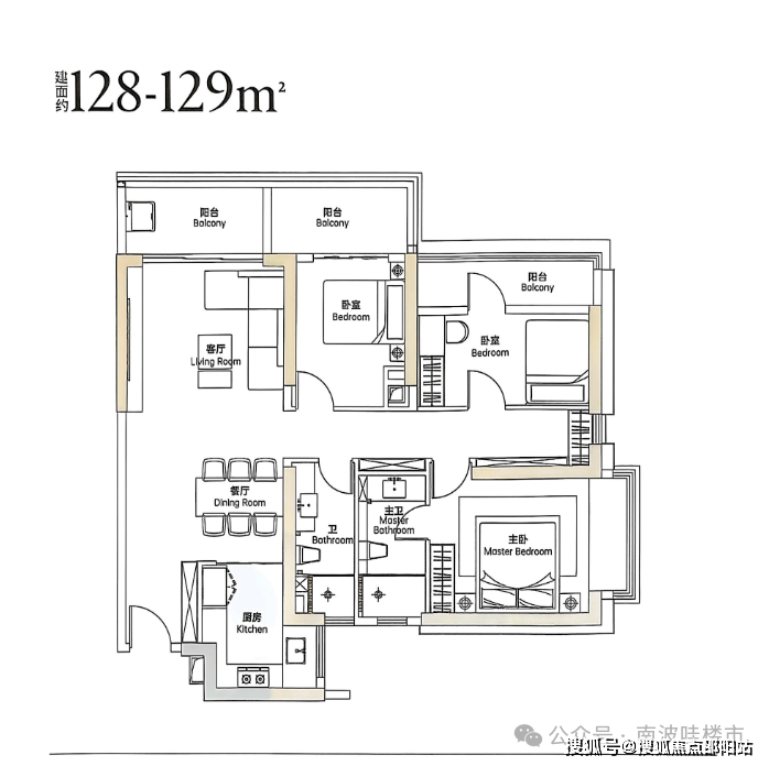 128㎡四房两卫,四个房间对立设计,做到了通风采光对流,厨房相对较小,实际样板房与户型图有差异。